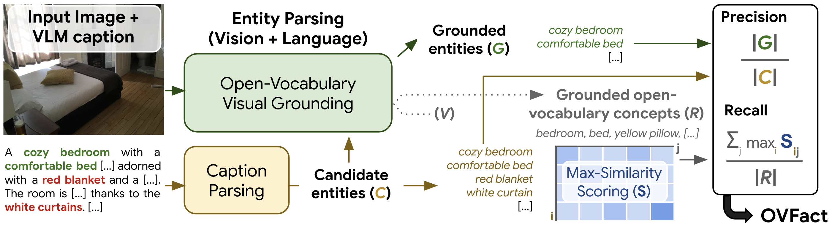 Overview of OVFact. Our reference-free method assesses two aspects of long captioning – precision and descriptiveness (recall) – in a unified manner, without requiring ground-truth reference annotations. We process a model output caption into a set of candidate entities C, and assess which subset G is groundable in the input image with open-vocabulary detection and segmentation tools. Precision is then measured as a ratio of entities remaining (e.g. above“red blanket” and “white curtains”detected as hallucinated). To measure descriptiveness, we assess a large open-vocabulary concept set V and identify which concepts are grounded in the image R, then measure their recall within the candidate entities from the VLM C caption using maximum similarity scoring. Unlike prior work (Petryk et al., 2024; Rohrbach et al., 2018; Kaul et al., 2024), our method can be directly applied to assess factuality in settings where only model-generated caption outputs are available, such as data filtering.